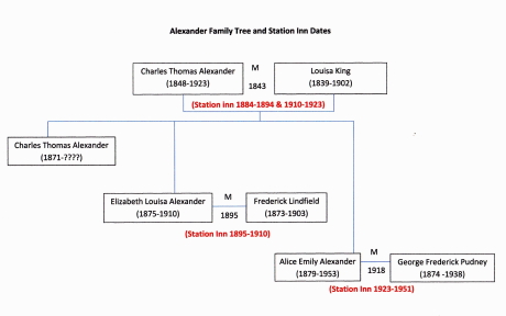 From 1910 Charles T Alexander is again listed in the street directories as landlord of the Station Inn until 1923. In the census of 1911 he is listed as a widower living with his daughter Alice aged 32 and two grandchildren; May and Alice Lindfield, aged 15 aged 13 respectively. Charles’s occupation is given as ‘beer retailer’ and Alice is listed as ‘manageress to above’. In addition to the Alexander family a visitor, G. Pudney, is listed on the census.