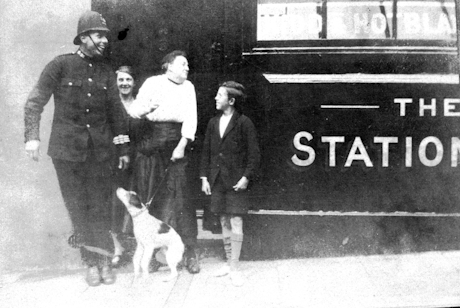 Alice Pudney, Dora and Sidney Brown and a laughing policeman outside the Station Inn 1928. The Kidd & Hotblack sign can be seen in the window. (Courtesy of Philip Godsiff)