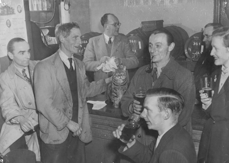 Leslie Godsiff behind the bar of the Station Inn, wiping glasses circa 1952. Note the large cat on the bar. (Courtesy of Philip Godsiff)