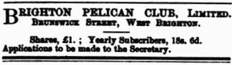 A particularly significant event was held on the 22nd February, 1894: it was the Club’s 5th Annual Dinner. Over a hundred people attended (all men) and the well laden benches were “groaning under the burden of tempting dishes” and the “choicest of wines”. The feasting and carousing was interspersed with frequent toasts and “war cries” from loyal Pelicans. The dinner itself concluded with the singing of a Grace sung by, Mr Welling’s daughter, Edith (so there was at least one woman present - however briefly). Then the men got down to business: an important speech about the Club’s future. Nelson Welling explained – it was an open secret – that the Club was to be incorporated and henceforth known as “The Brighton Pelican Club Ltd”.