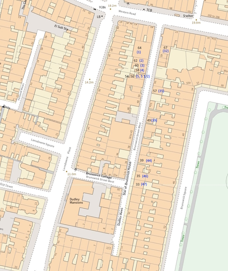 Note that the houses in Brunswick Square on the west side, backing onto Brunswick Street West, were formally renumbered by increasing their numbers by two at the end of 1834 and, presumably, those stables which had been built followed the same renumbering.