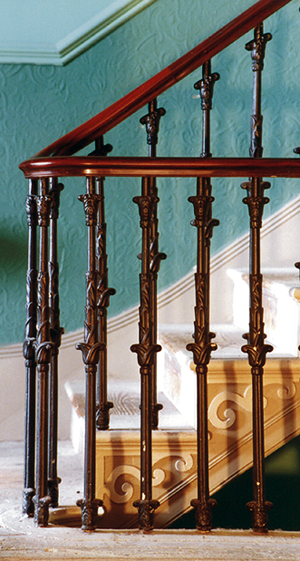 The handrail is made from expensive imported mahogany and is supported by cast iron balusters, probably manufactured at a local foundry. Many houses had dado rails in the halls and stairways but these were not included in the original decorations at The Regency Town House.