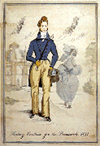 The greatest change in menswear during the Regency period was the swap from breeches to trousers. This was an influence from the famous Beau Brummell who wore trousers with a strap underneath similar to present day 'ski-pants' which enabled them to keep free of wrinkles. Trousers were usually made from corduroy and buckskin. They were also skin tight resulting in many euphemisms emerging for them such as 'unwhisperables' and 'unmentionables'.